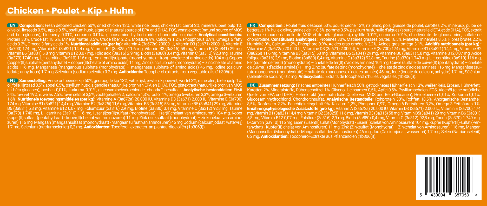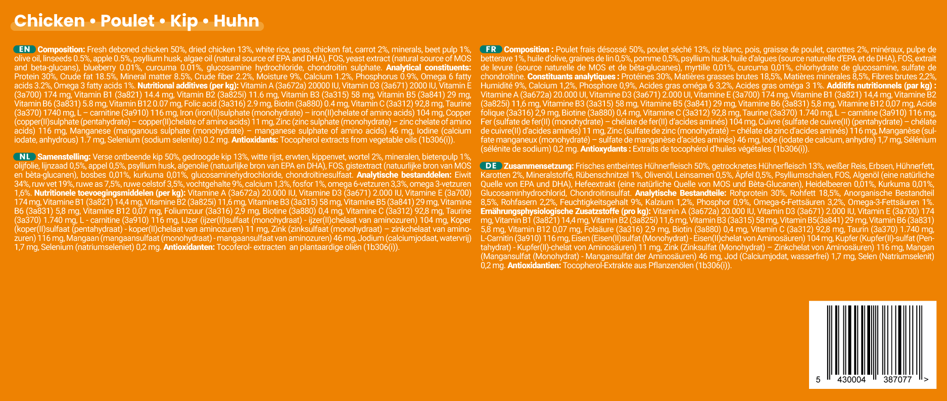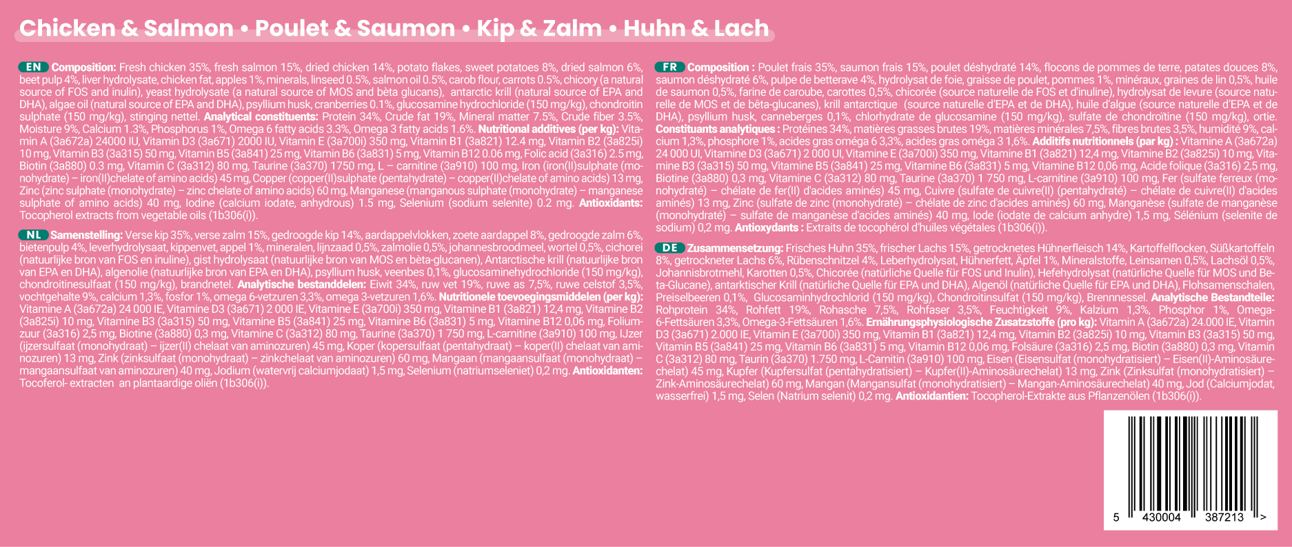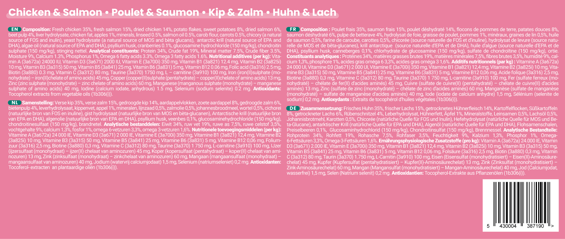 Mix of the 5 recipes : 14 chicken, 12 beef/chicken, 6 fish, 8 duck & 10 pork (keeps 1 week fresh in the fridge and 12 months in the freezer)