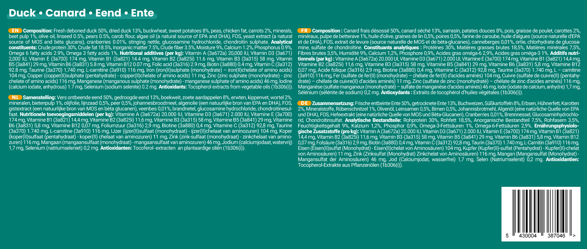 Complete and balanced duck recipe with sweet potatoes & vegetables (Can be kept for 1 week in the fridge and 12 months in the freezer)